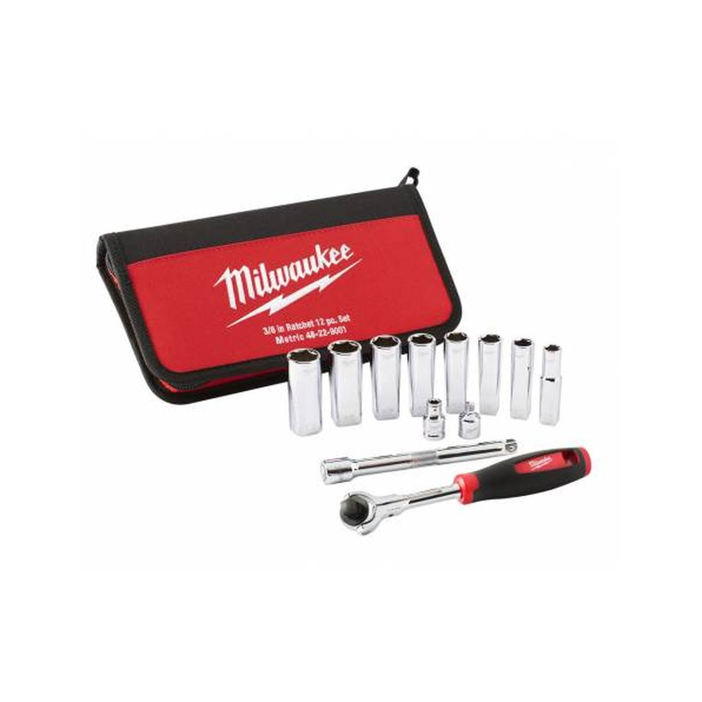 Zawiera : Grzechotka ⅜˝, nasadki ⅜˝ 10, 12, 13, 14, 15, 17, 18, 19 mm, uchwyt do bitów, adapter kwadrat 1/4˝, przedłużka