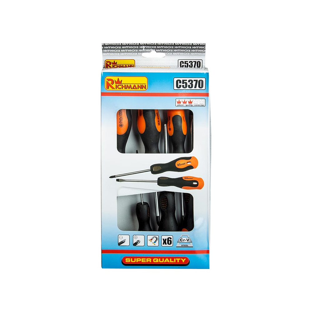 Zestaw zawiera 6 sztuk wkrętaków płaskich oraz krzyżakowych
